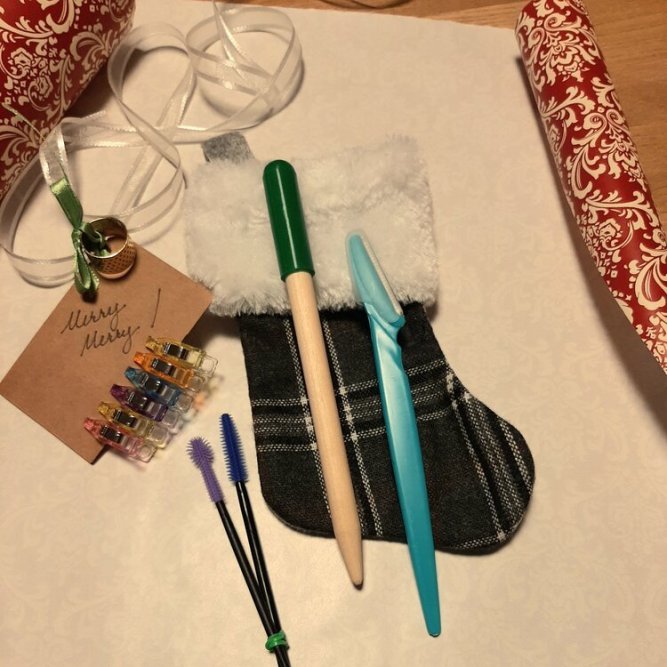 Santa's put together the nicest one of a kind gifts for you or a special friend! You’ll receive a stocking stuffed with a set of two Just Better brushes, an Unsewing Kit, half a dozen Mini Fabric Clips, and a brass-toned ring thimble. We’ll even enclose a blank gift card to make giving easy! This bundle is the perfect present for a Secret Santa exchange or stocking stuffer. $16.99, while supplies last!