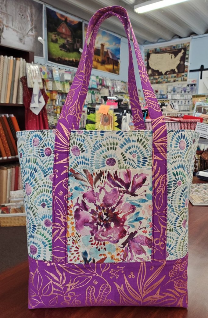 This roomy tote holds so much! Perfect for weekend trips, quilt retreats, work, the gym, a diaper bag - the uses are endless! Great to bring to quilt shops and load up with fabric and notions! The Tourist Tote is quite simple to make. No inside pockets, zippers or closure! Finished Size : 18-1/2"W Top x 12"W Bottom - 12"H x 7"D. Class $25 plus supplies. Sign up here today! Kits available.