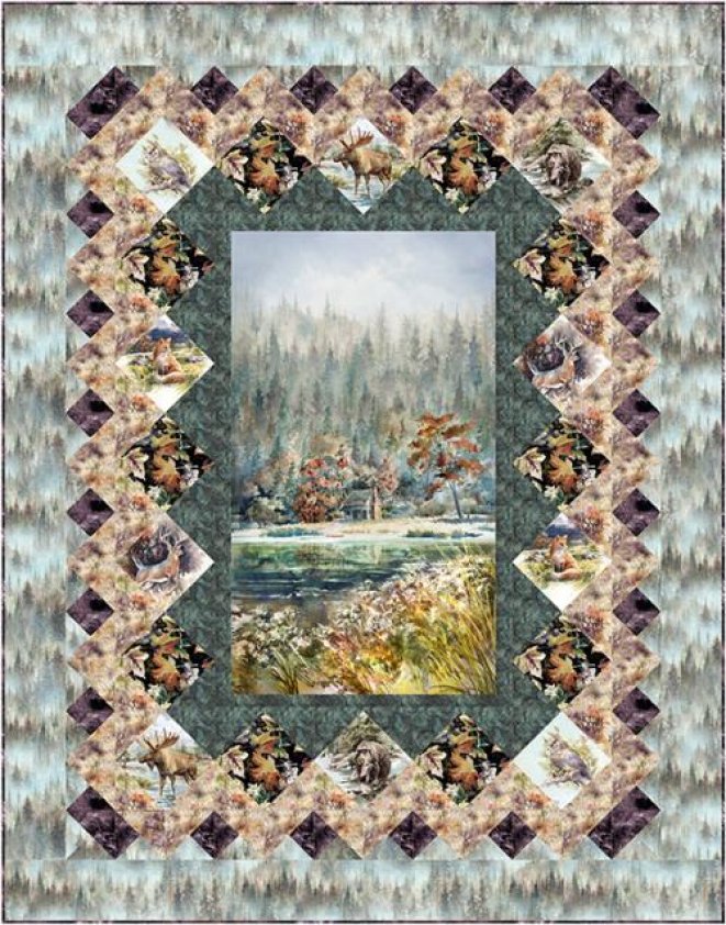 Experience the timeless serenity of the woods in a wall quilt featuring a tranquil center panel framed by diamonds of fussy cut wildlife prints. Kit includes digitally printed fabrics for the top and the binding from the Woodland Whispers collection by Hoffman Fabrics. Kit is 65" x 73". Click here to purchase today!