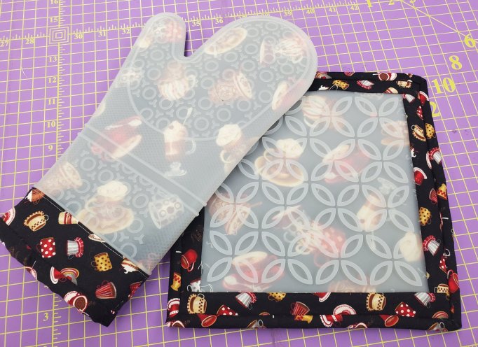 Create your own designer oven mitt or trivet, or both, with a silicone overlay. The oven mitt measures 13" H by 7 1/2" W and the trivet comes in 2 sizes 9 1/2" square or 9" by 12".