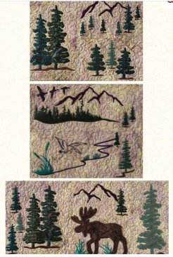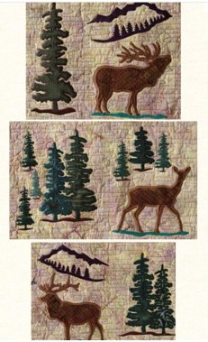The embroidery designs include bear, deer, elk, and moose in a mountain forest setting with a total of 27 applique embroidery designs. These designs are perfect for decorating that Montana home or mountain cabin.