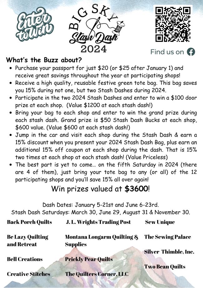 Don't miss out on the last Big Sky Stash Dash 2023 shopping day, Saturday, December 30. This will be a great time to buy your bag for the 2024 Stash Dash from a participating shop before the bags increase on January 1, 2024. We have lots of fun planned for you this year! Find details below.